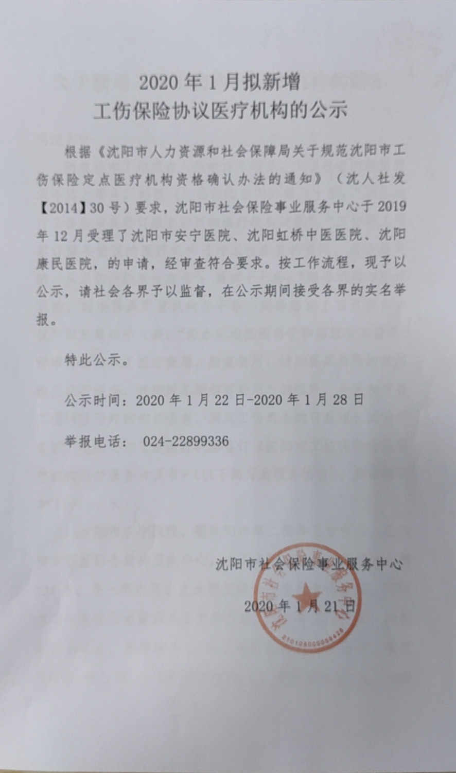 2020年1月拟新增工伤保险协议医疗机构的公示